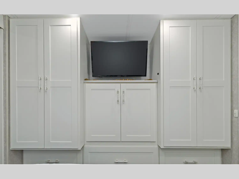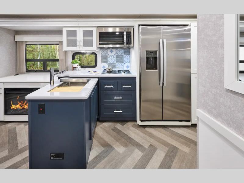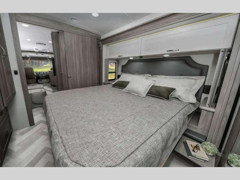 Sleeps 5 Slides 2 Length 35 ft 10 in Ext Width 8 ft 6 in Ext Height 12 ft 1 in Int Height 6 ft 10 in Interior Color Organic Comfort Dark, Organic Comfort Light, Bohemian Oasis Exterior Color Full-Body Paint; Silvermist, Wedgewood ll, Steel Grey, Night Sky Hitch Weight 5000 lbs GVWR 22000 lbs Fresh Water Capacity 74 gals Grey Water Capacity 51 gals Black Water Capacity 63 gals Tire Size 22.5" Furnace BTU 40000 btu Generator 5,500-Watt Cummins Onan Marquis Gold Fuel Type Gas Engine 7.3L V8 Chassis Ford F53 Fuel Capacity 80 gals Wheelbase 228 in Available Beds King Refrigerator Type Stainless Steel Residential with Ice Maker and Water Dispenser Convection Cooking Yes Cooktop Burners 3 Shower Size 36" x 36" Number of Awnings 1 Axle Weight Front 8000 lbs Axle Weight Rear 15000 lbs LP Tank Capacity 76.14 lbs Water Heater Capacity 10 gal Water Heater Type 110V/LP AC BTU 28500 btu Basement Storage 137 cu. ft. TV Info LR 39" HDTV, BR 32" HDTV, Ext. 32" HDTV Awning Info 16' Power w/LED Lighting Washer/Dryer Available Yes Gross Combined Weight 26000 lbs Shower Type Standard Electrical Service 50 amp Similar Floorplans